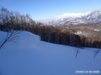 しっかりと1週間熟成させたパウダースノー、たった1日だけでは滑り切れません。1日たっぷりと、前モモが熱くなるほどノートラックパウダーを滑ってもまだまだ残るフレッシュパウダーに後ろ髪をひかれながら、あっという間の日暮れを迎えました。もったいないですが仕方がありません。