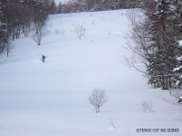そして最終日には、待っていました!天気が回復。晴れ間も出て、湿度も下がり、雪はどんどんDry out!! 気が付けばいつものTENGUエリア、世界遺産登録待ち(!?)の極上パウダー!! 真っ新な雪面に、皆さま思い思いのシュプールを描いていただきました。