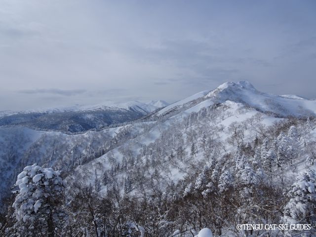 深い雪の中をラッセルして進みますが、雪が軽すぎてお客様もびっくりの楽々登高。風の影響でナマコの様に波打った電光坂にジグを切り登り詰めると、1,468mの前天狗岳ピークです。めったに訪れないこの山頂からは、冬季はなかなか見えない北大雪最高峰ニセイカウシュッペ山や地元の雄・平山など壮大な山並みが迎えてくれました。ニセイカウシュッペ山が冬にここまでクリアに見られるのは、ここ数年でもかなりレアですよぉ!!!! そこからは天国の稜線歩きで白滝天狗岳山頂直下のコルまで。きれいな森の中で一息入れたのち、ついにドロップポイントまで。