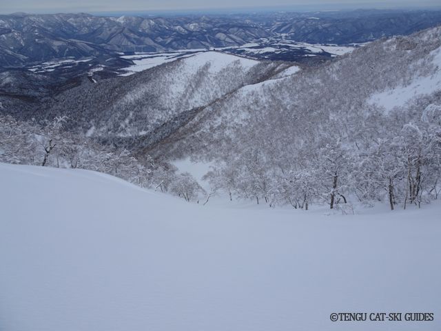 2日目は気圧配置が緩み、TENGUパウダー劇場本番です。期待に応えつつ、(良い意味で)期待を裏切りつつ、ノートラックパウダーを右から左へ、左から右へ、オープンへツリーへと縦横無尽に楽しんで頂き、午後には一度目のクライマックス・・・【世界「雪」遺産(独自認定)】のあの場所へ。