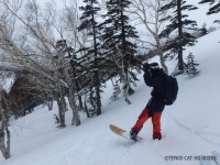 そんな中集まったゲストは4名のスノーボーダーの方々。本日のフィールドは、広い面で雪面をナデナデできるスノーボーダーに持ってこいのコンディションです。ショートターン、ロングターン、深い雪、浅い雪、パックした雪、ふわふわな雪、もっちりした雪とどれもこれも楽しく遊べました!変化に富んだロングランも最高でした!!板も良く走り、気持ち良く滑れました!!!!
